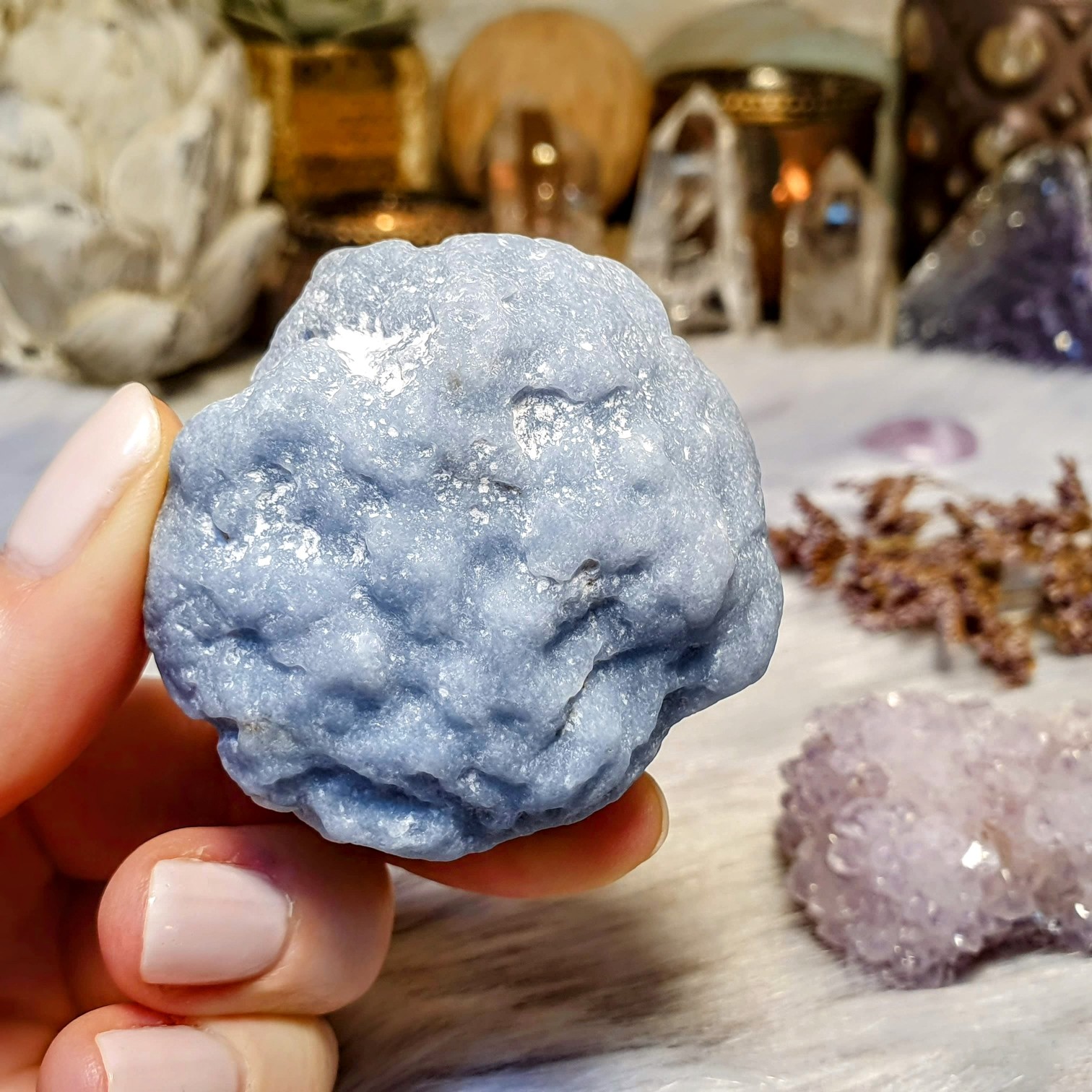 - Tento nádherný přírodní kámen angelitu je lehce "otryskován" a tím je zbaven hnědé svrchní krusty, aby vynikla jeho pěkná, světle modrá podstata v plné kráse. Zachoval si přírodní charakter a vyzařuje z něj příjemná, uklidňující energie. Svým přirozeným tvarem i barvou může připomínat křídlo anděla či obláček na nebi