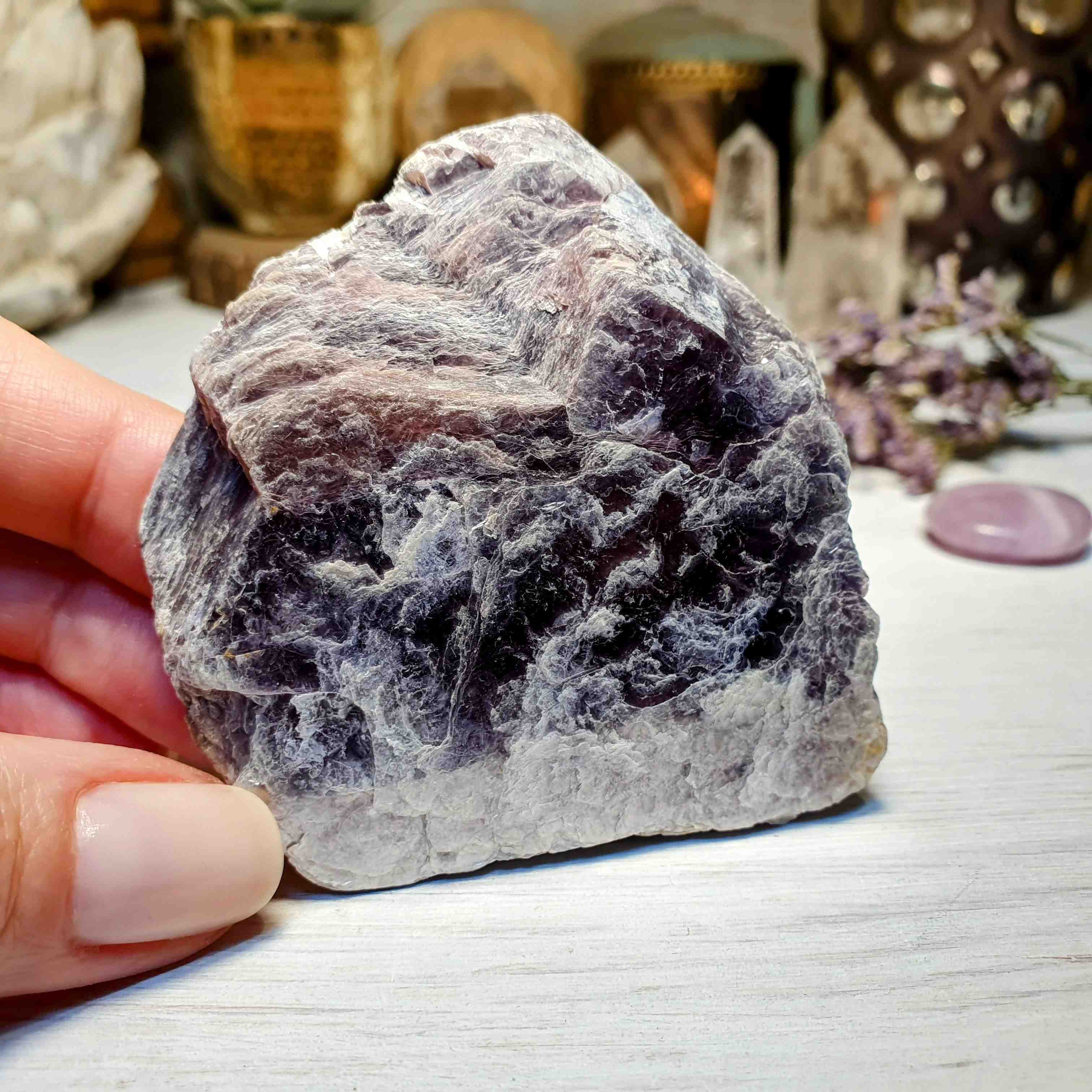 Jednou z úžasných vlastností na této formě Lepidolitu je její magický „zrcadlový trik“ - vrstvy slídy jsou vysoce reflexní a vypadají neprůhledně, ale když je podržíme proti světlu (v závislosti na jejich tloušťce) můžeme vidět, že jsou průsvitné.