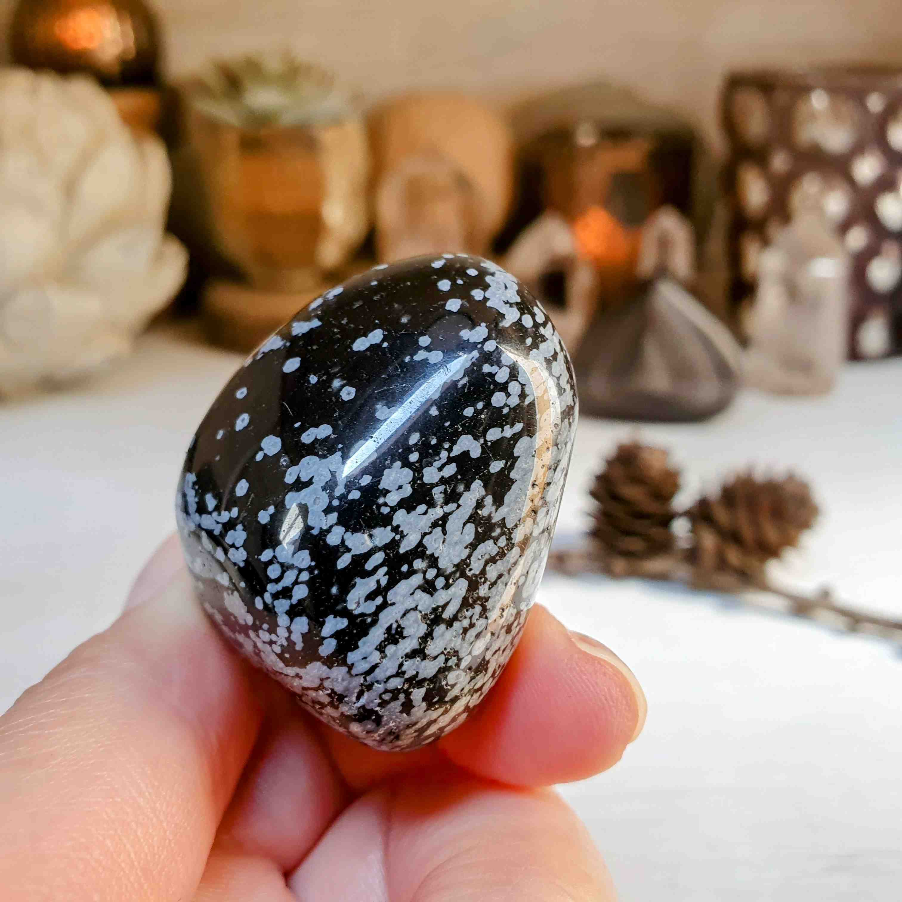 Obsidián vločkový je kámen sebereflexe, který nám umožňuje nahlédnout hluboko dovnitř sebe a dává nám sílu změnit vše, co je potřeba k tomu, abychom nezůstavali v bludném kruhu, ale mohli růst a posouvat se dál.