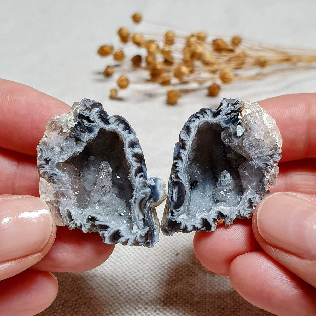 - Exkluzivní pár nádherných peříčkových achátových geod s krásným lemem ( okrajem) a dutinou posetou malinkými třpytivými krystalky křemene - většinou křišťálu, vzácněji ametystu či záhnědy. Skvěle se pozoruje pod lupou