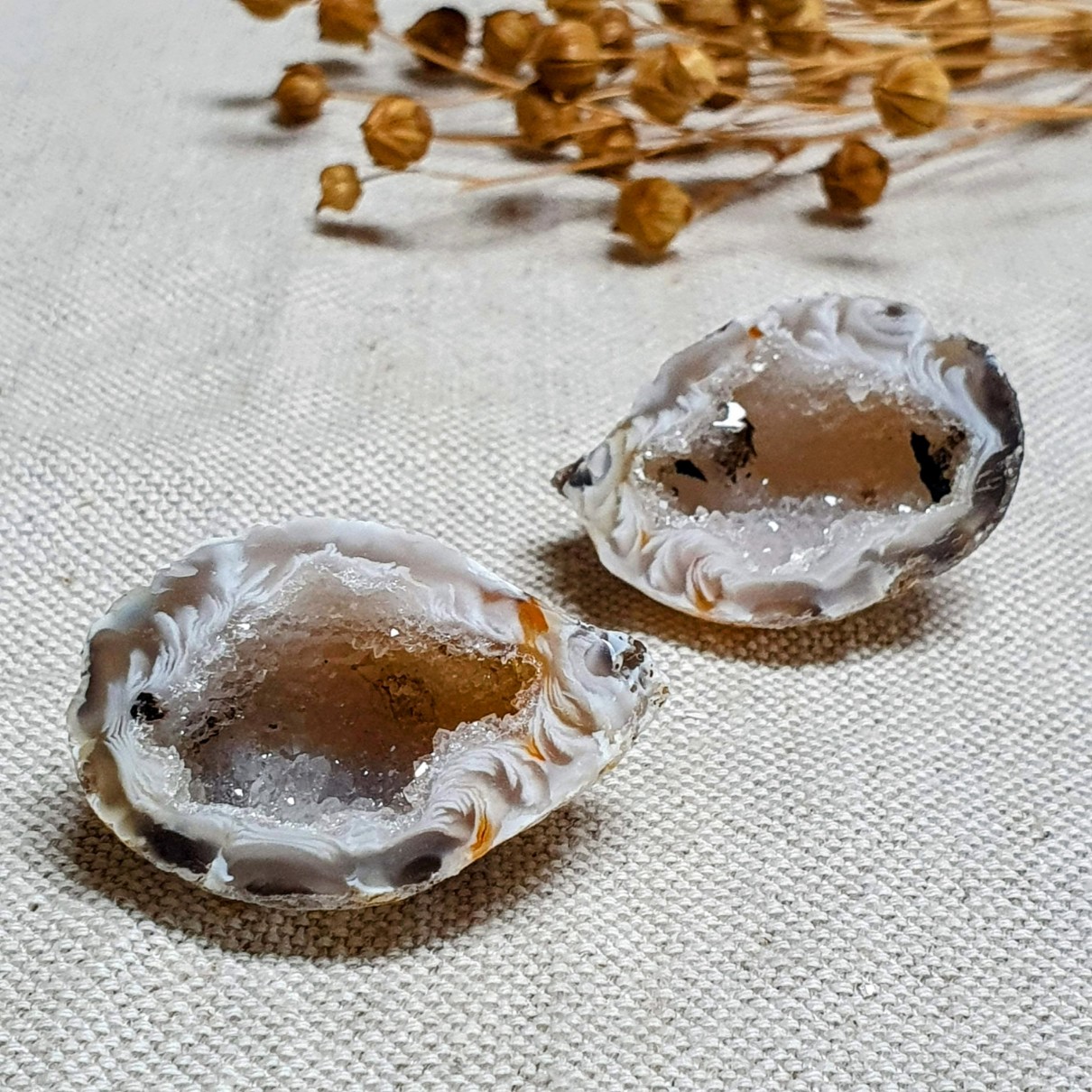 - Exkluzivní pár nádherných peříčkových achátových geod s krásným lemem ( okrajem) a dutinou posetou malinkými třpytivými krystalky křemene - většinou křišťálu, vzácněji ametystu či záhnědy. Skvěle se pozoruje pod lupou